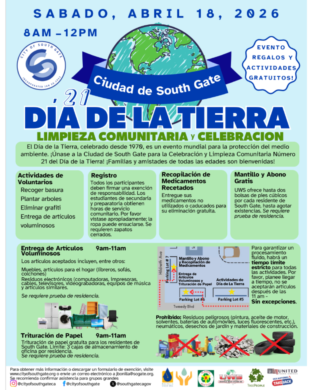 Celebrate Earth Day with the City of South Gate by participating in our 21st Annual Earth Day Community Cleanup & Celebration. This family-friendly event invites residents of all ages to come together and help keep our community clean and green through activities such as litter cleanup, tree planting, and graffiti removal.