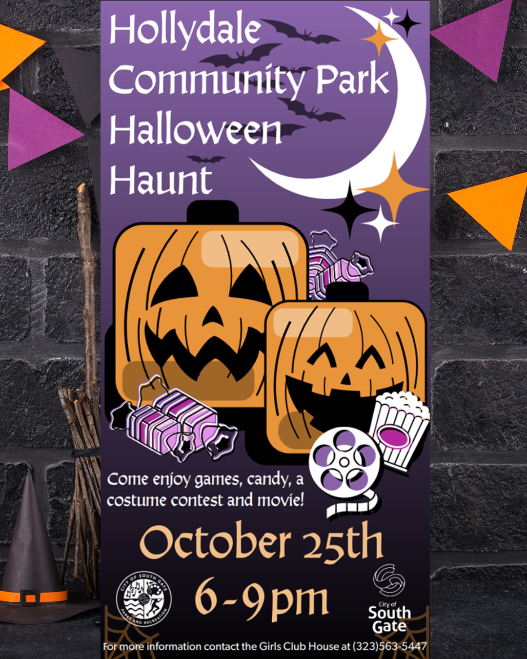 Join us for the annual Halloween Haunt at Hollydale Community Park on Friday, October 25th. Enjoy a family-friendly evening with games, candy, a costume contest, and a movie under the stars! Bring your friends, dress in your best costume, and celebrate Halloween with the South Gate community.
