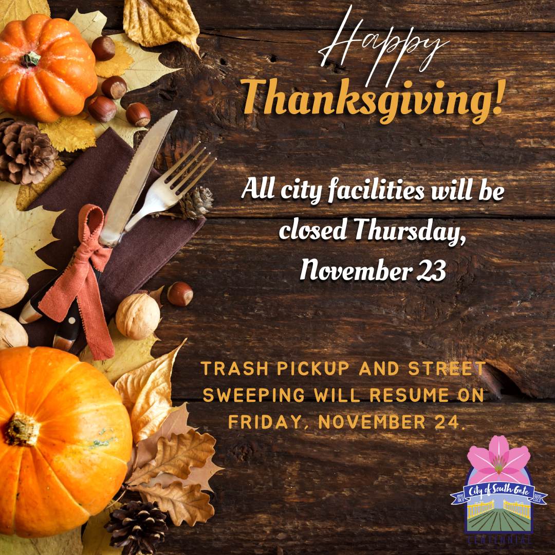 All City facilities, except the Police Department, will be closed on Thursday, November 27th, in observance of Thanksgiving Day.